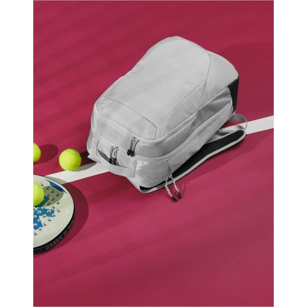 Contains 100% GRS certified recycled polyester, certified by Control Union CU811033 Two-way zippered opening for easy access Dedicated racquet pocket Fits racquets up to approx. 23cm wide Hockey stick sleeve with elastic retainer External stretch pocket for water bottle Zippered front pocket TearAway label for ease of rebranding